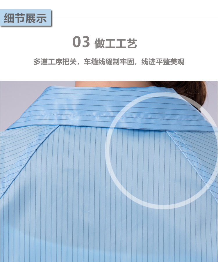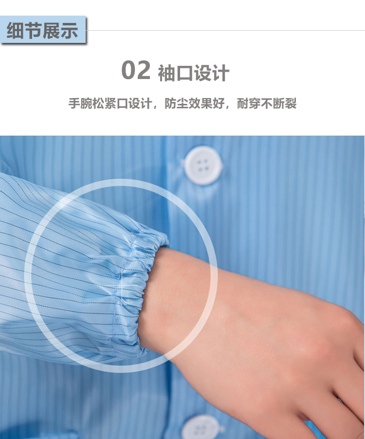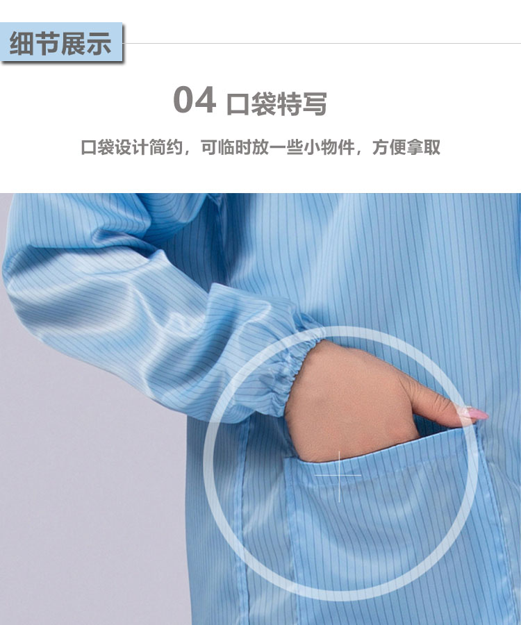 防靜電無塵大褂采用的導電綢面料除了具有良好的防靜電功能外,其面料同時還具有本身不發塵、不沾塵、阻隔性好,高密度等功能,一般應用于實驗室、無塵凈化車間里。根據潔凈室的要求,可以選擇0.5CM條紋、0.5CM網格、0.25CM網格等導電綢面料的無塵服。