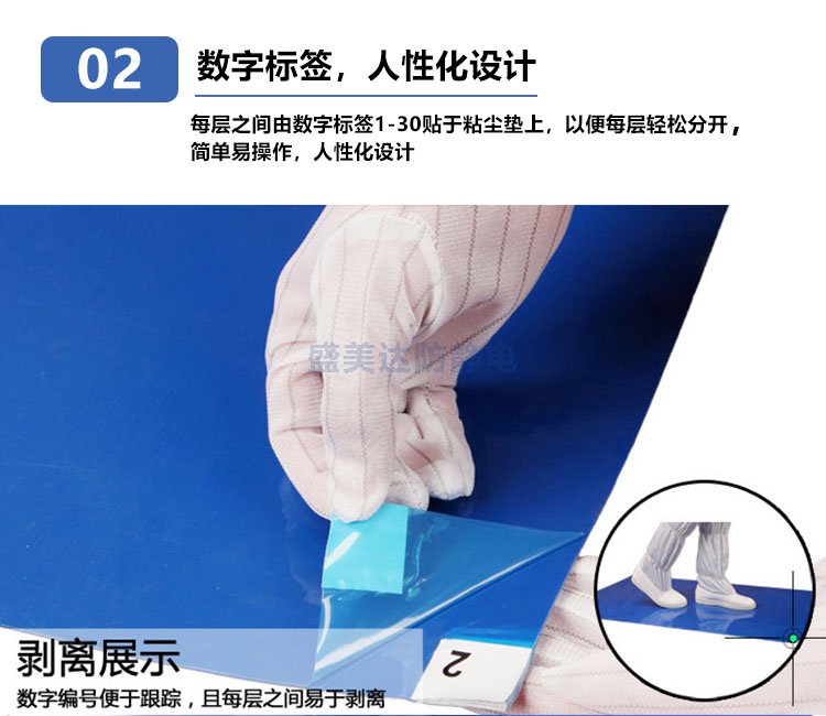 粘塵墊又稱粘塵地墊、粘塵地板膠,采用優質低密度聚乙烯材料和環保型壓敏水溶性粘合劑經過特殊工藝復合而成,能使粘塵墊每層表面粘性均勻,不掉膠,無氣味,環保無毒。粘塵墊主要適用于貼放在無塵潔凈空間的入口處及緩沖區間,它能有效地粘除鞋底和車輪上的灰塵,最大限度的減少塵埃對潔凈環境質量的影響,從而達到簡易除塵的效果,是無塵潔凈車間除塵的重要方式之一。產品廣泛應用于微電子、半導體、生物制藥,醫療器械、食品加工和醫院等各行業。