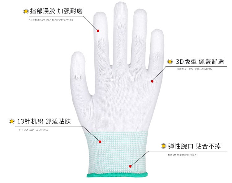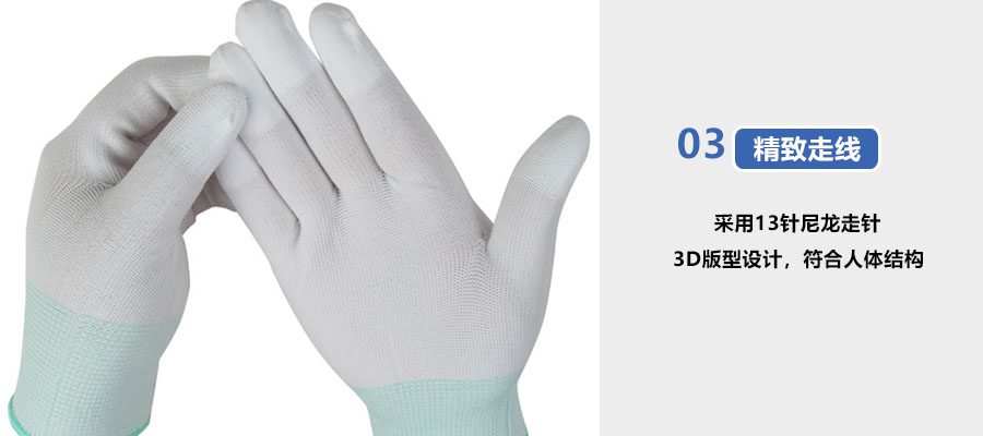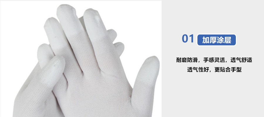 PU涂層手套又稱PU涂膠手套,根據(jù)涂膠的部位分為PU涂指手套、PU涂掌手套。其制作方法是在針織尼龍手套的手指或手掌部位涂上一層PU樹脂,這樣既增加了防滑性能,又增加了隔熱性能,同時(shí)能防止人體手掌的手汗和微粒污染,是精密電子生產(chǎn)線不可缺少的產(chǎn)品。可用于精工制造業(yè)、紡織業(yè)、電子行業(yè)、電力工程、汽車裝配、無塵車間等領(lǐng)域。