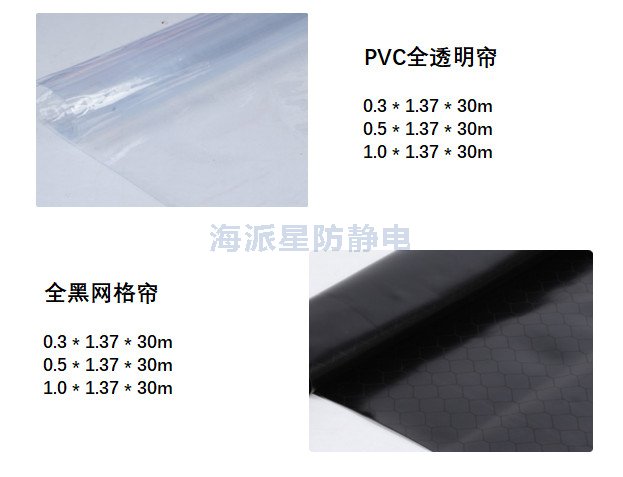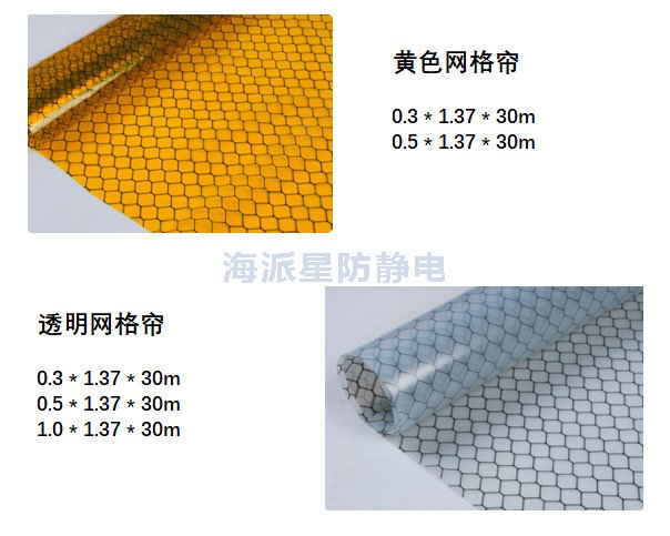 防靜電款式:PVC全透明簾、防靜電透明網格簾、全黑防靜電網格簾、黃色防靜電網格簾。