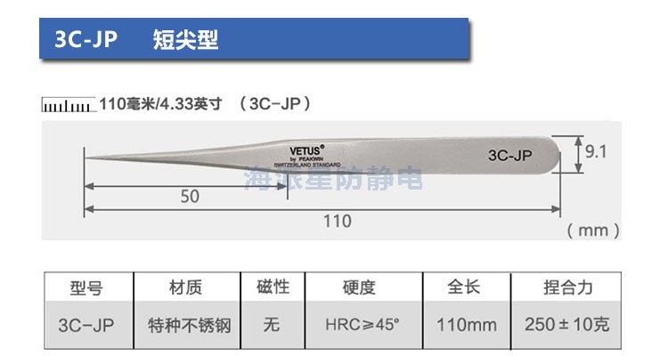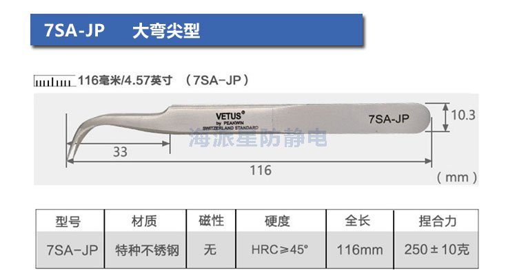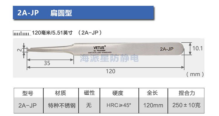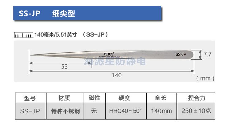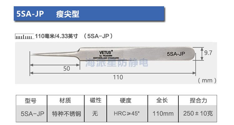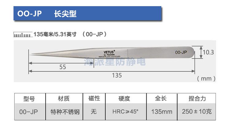 VETUS/維特斯品牌鑷子,產品系列有:電子鑷子系列、JP系列、SA系列、ST系列、ESD防靜電系列、SED可換頭防靜電系列、MCS美容鑷子系列共100多個品種,產品具有超精細、高精密、抗磁、抗酸、超硬又有彈性、超耐用等特點。產品銷往三十多個國家和地區,成為全球很有知名度的國際品牌產品。